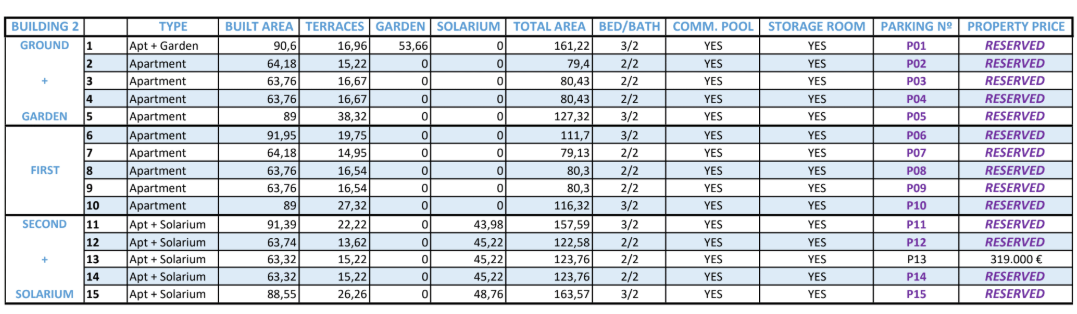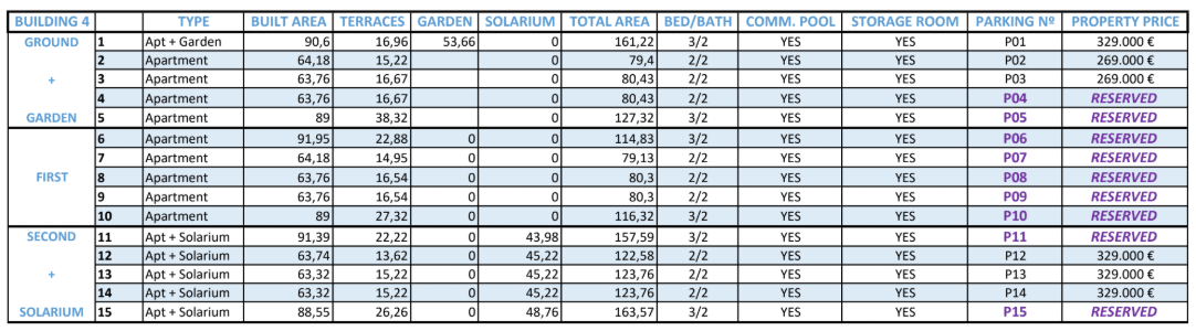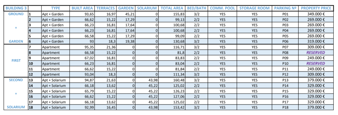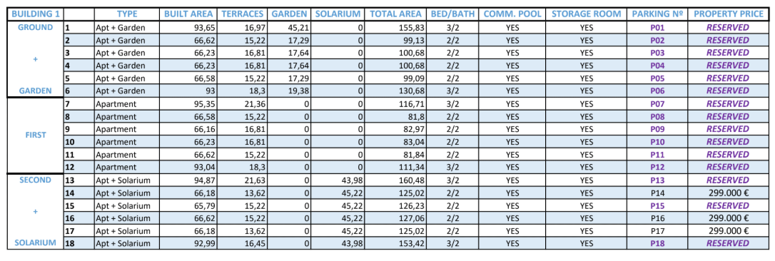 The complex will consist of 4 blocks, with a total of two blocks of 15 units and 2 blocks of 18 units. Each apartment has an open plan living area with direct access to the terrace. There is a choice of 2 or 3 bedrooms, all with fitted wardrobes and 2 bathrooms. The first floor homes have a garden as an extra and the penthouses come with a solarium.